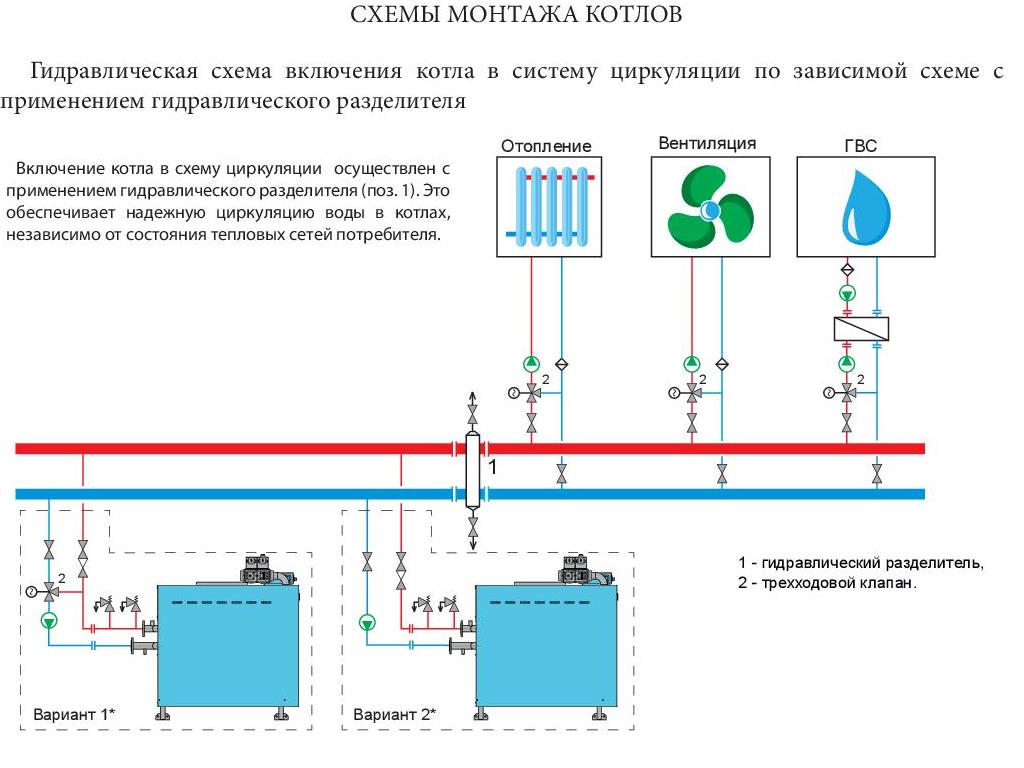 Гидравлическая схема подключения котла RSA по зависимой схеме с применением гидравлического разделителя