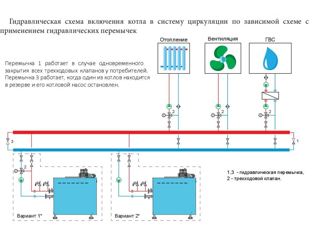 Гидравлическая схема подключения котла RSA по зависимой схеме с применением гидравлических перемычек