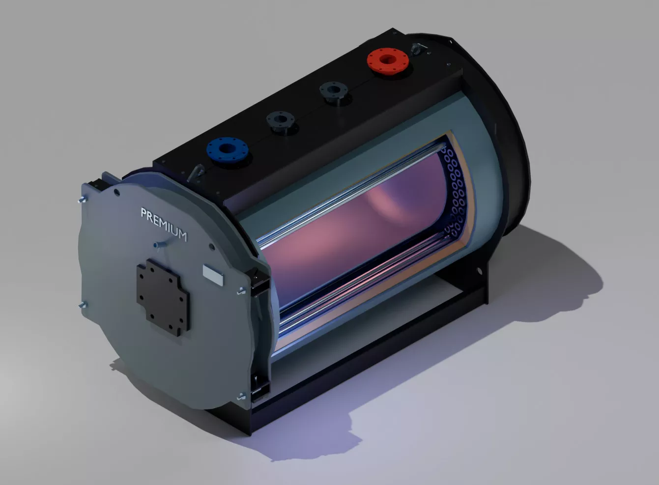 Котлы PREMIUM С данной модификации производятся в диапазоне номинальной мощности от 250 кВт до 6 МВт. По желанию заказчика котлы комплектуются горелкой, системой автоматического управления (термостатическая, шкаф управления водогрейным котлом PREMIUM, каскадный шкаф управления PREMIUM).